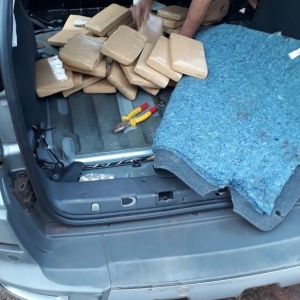 A equipe vistoriou e identificou em um fundo falso a quantidade de 37 tabletes de maconha que após pesados totalizaram 26,065Kg.