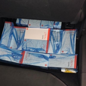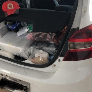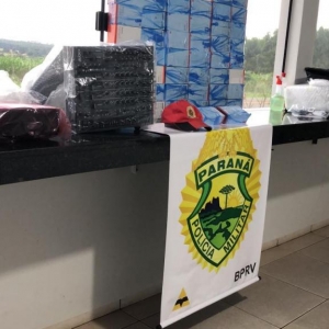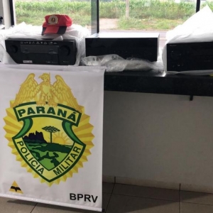 Foi vistoriado o interior do veículo onde foi localizado vários tipos de eletrônicos no valor aproximado de R$ 60.000,00 (sessenta mil reais) em aparelhos celulares, retroprojetores, mesa de som e home theater, possivelmente compradas no Paraguai.
