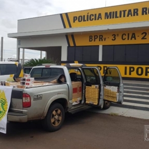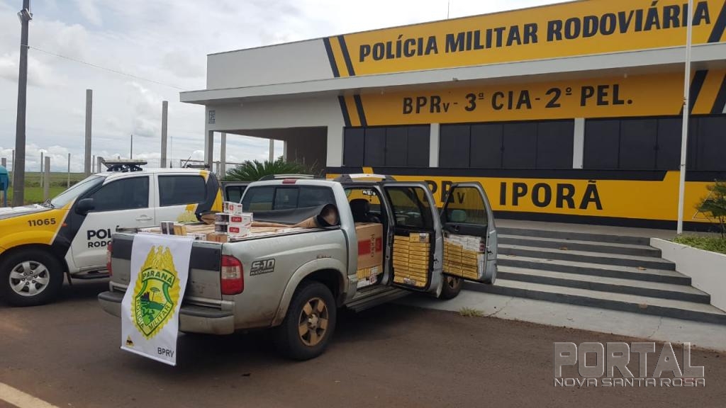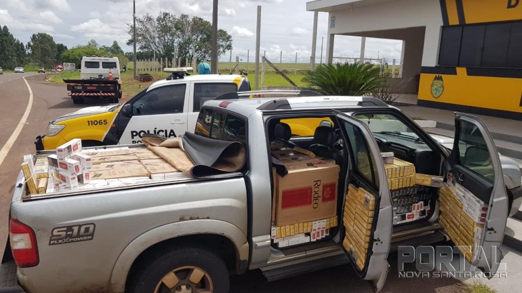 Após vistoria no interior do veículo GM/S10, cor prata, ano 2008/2009, licenciado na cidade de Paranavaí, foi encontrado no seu interior e compartimento de carga aproximadamente 20 caixas de cigarros de diversas marcas, de origem estrangeira e sem a devida documentação.