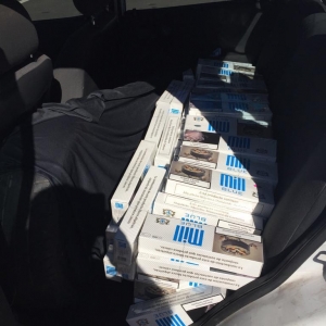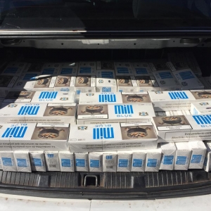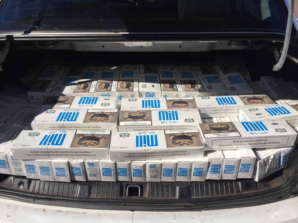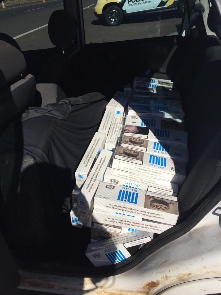 Durante vistoria no veículo Corsa, ano 2003, de placas de Umuarama, foi encontrado no seu interior e no porta malas vários pacotes de cigarros da marca Blue.