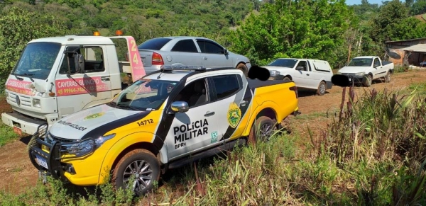 Na manhã desta quinta- feira (19), durante patrulhamento na rodovia estadual PR-488, zona rural de Diamante do Oeste, policiais rodoviários observaram alguns veículos trafegando em comboio e em alta velocidade, oportunidade em que foi feito uma tentativa de abordagem, porém, os condutores não acataram a ordem de parada, evadindo-se através de uma estrada rural.