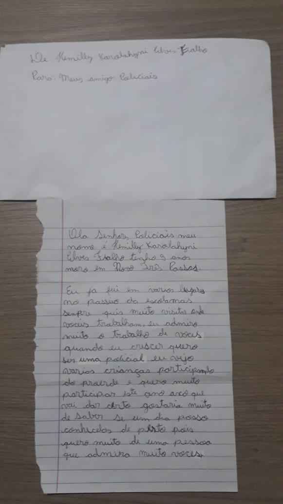 Na oportunidade foi entregue um singelo presente em comemoração à data especial. Hemilly há alguns meses enviou uma cartinha para a PRE de Marechal, na qual dizia que gostaria de conhecer o posto e o trabalho da Policia Rodoviária. Na época, ela residia em Novo Três Passos, assim, ela e os pais estiveram no posto conhecendo tudo.