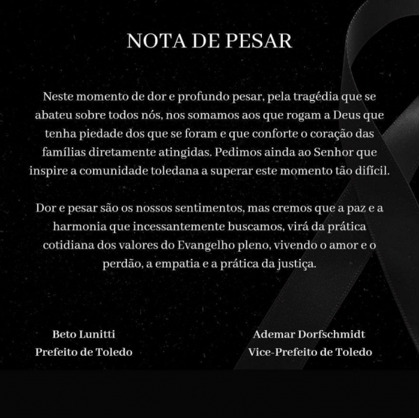 O prefeito de Toledo, Beto Lunitti, publicou nota de pesar após a chacina que ocorreu entre a noite de ontem e esta madrugada, a qual teve sete pessoas mortas no município e outras duas em Céu Azul.