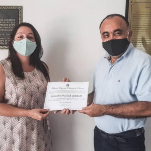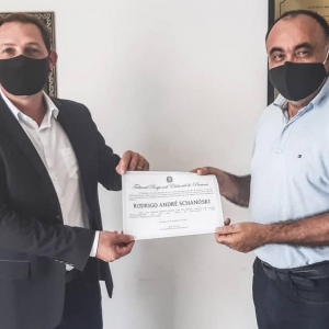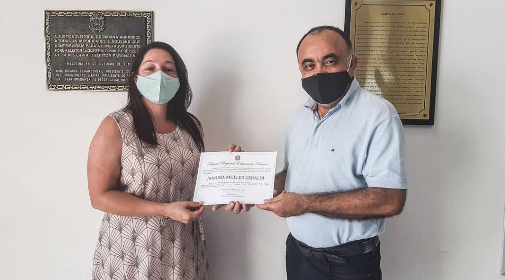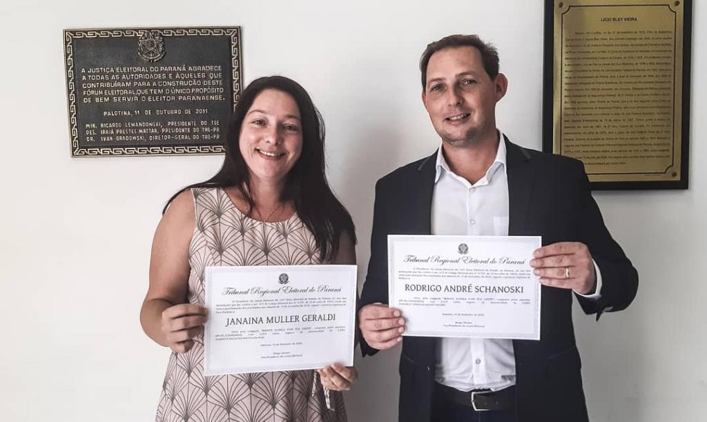 Em seu primeiro mandato, Rodrigo e Janaína receberam os diplomas das mãos do chefe do Cartório Eleitoral, Joaquim Bortot para integrar o Executivo no quadriênio 2021/2024.