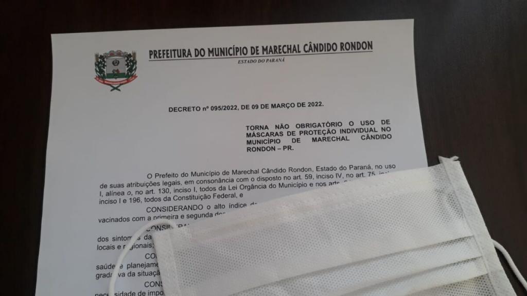 O prefeito de Marechal Cândido Rondon, Marcio Rauber, emitiu o decreto nº 095/2022, que foi publicado no Diário Oficial Eletrônico nesta quinta-feira (09), que torna não obrigatório o uso de máscaras de proteção individual no município em virtude da pandemia da COVID-19, em local aberto ou fechado.