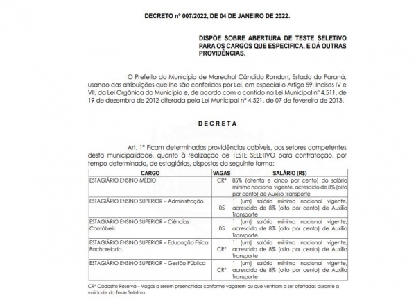 Decreto publicado quinta-feira (13) no Diário Oficial Eletrônico de Marechal Cândido Rondon, dispõe sobre a tomada de providências cabíveis sobre a realização de teste seletivo para a contratação, por tempo determinado, de estagiários.