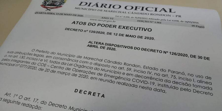 Na manhã desta quarta-feira (13), foi publicado no diário oficial do município de Marechal Rondon, o Decreto nº 135/2020, que traz novas decisões tomadas pelos integrantes do COE – Centro de Operações de Emergência COVID-19.