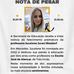 É com profundo pesar que a Prefeitura de Mercedes, por meio da Secretaria de Educação e Cultura, recebe a triste notícia do falecimento prematuro da professora Jucelene Juraci Biesdorf, aos 51 anos de idade, ocorrido nesta quinta-feira (21).