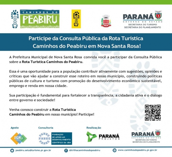A Prefeitura de Nova Santa Rosa, por meio da Secretaria de Indústria, Comércio e Turismo, convida toda a comunidade a participar da Consulta Pública sobre a Rota Turística Caminhos do Peabiru.