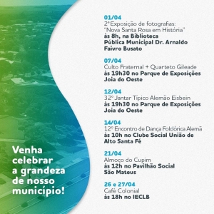 01/04 – 2ª Exposição de Fotografias “Nova Santa Rosa em História” na Biblioteca Dr. Arnaldo Faivro Busato durante todo o mês de abril: 8h às 11h30 e das 13h30 às 17h;