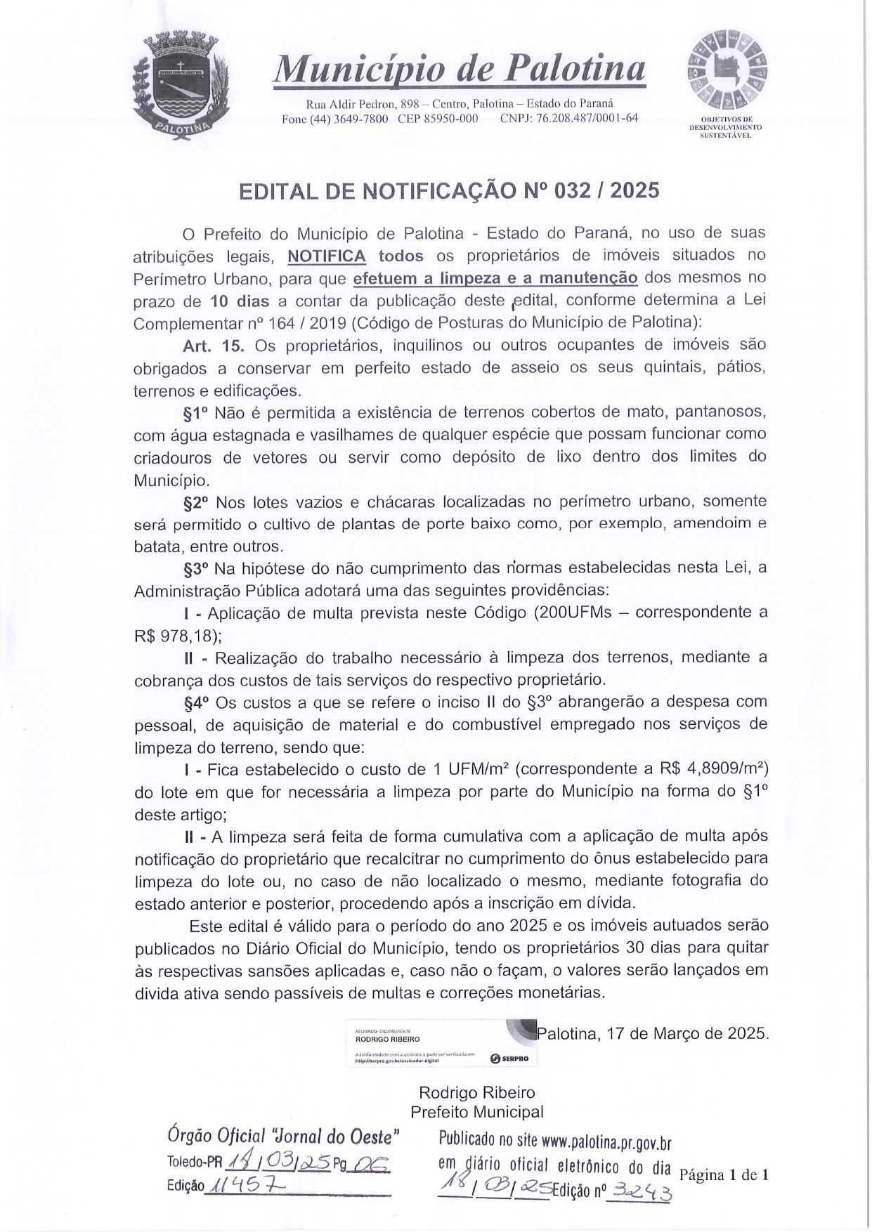 A Prefeitura de Palotina está notificando os proprietários de imóveis situados no perímetro urbano, para que realizem a limpeza e manutenção de seus terrenos até o dia 28 deste mês.