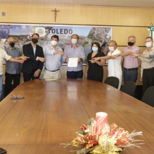 Um passo importante para a melhoria dos serviços de saúde para a população de Toledo e região foi dado na manhã desta terça-feira (22). Representantes da Prefeitura de Toledo; da Associação Paranaense de Cultura (APC), mantenedora do câmpus Toledo da Pontifícia Universidade Católica do Paraná (PUCPR); e da Associação Beneficente de Saúde do Oeste do Paraná (Hoesp), entidade que administra o Hospital Bom Jesus estiveram reunidos na Sala de Reuniões do gabinete do prefeito Lucio de Marchi para a sanção à Lei Ordinária “R” nº 91/2020, publicada no Órgão Oficial.