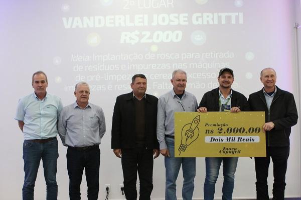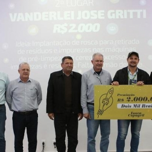 Em segundo lugar com prêmio de R$ 2.000,00 para Vanderlei Jose Gritti sugerindo a implantação de rosca para retirada de resíduos e impurezas nas máquinas de pré-limpeza de cereais, excesso de impurezas e resíduos, falta de mão de obra.