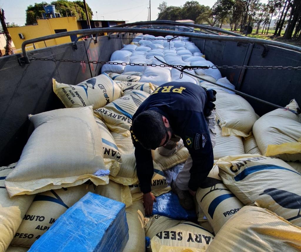 A Polícia Rodoviária Federal (PRF) apreendeu, na tarde de segunda (12), 2,7 toneladas de maconha, que estavam escondidas sob sacos de grãos, em Ubiratã (PR). O motorista, de 40 anos, foi preso.