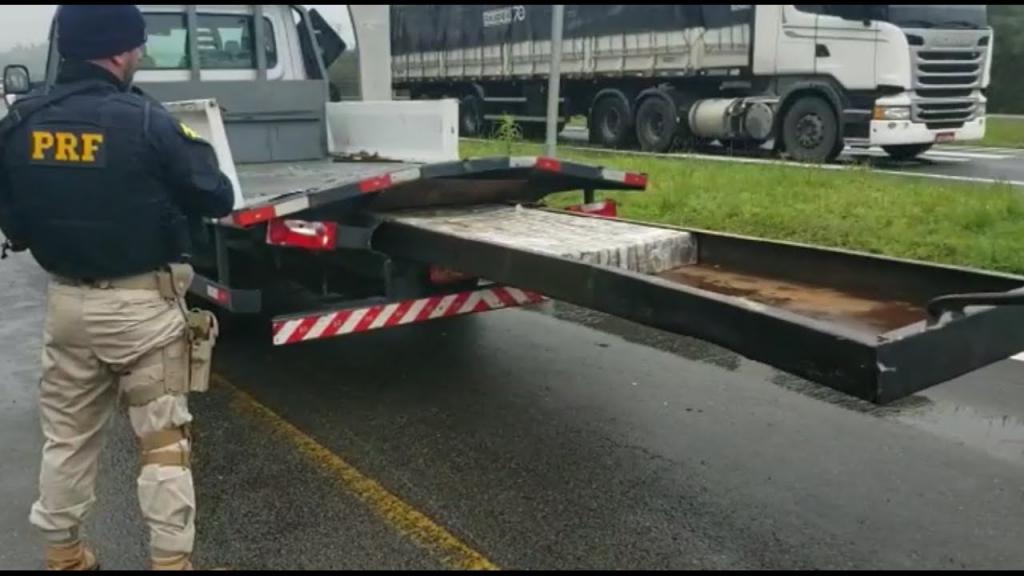 Na carroceria, os policiais rodoviários federais descobriam um compartimento oculto, no formato de uma gaveta, entre as longarinas do chassi do veículo.