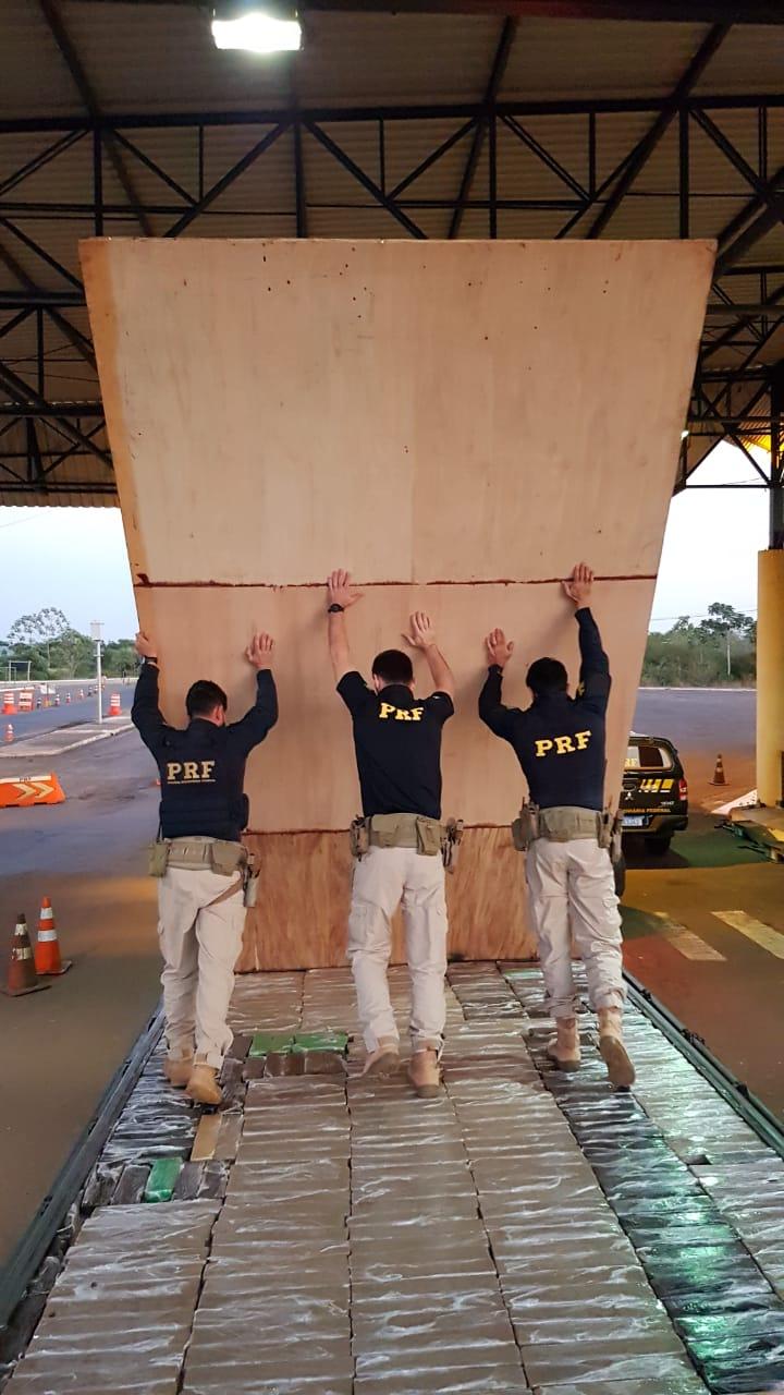 Desconfiados, os policiais resolveram intensificar a fiscalização, realizaram verificação na carroceria e descobriram o fundo falso onde estava oculta a droga, totalizando 644 kg maconha.