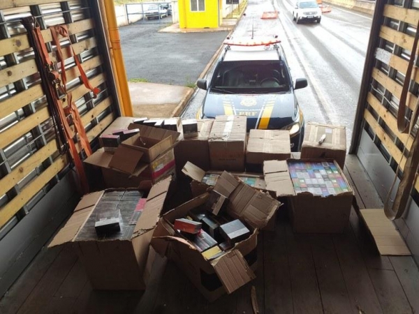 A Polícia Rodoviária Federal (PRF) apreendeu na tarde deste domingo (9) um caminhão carregado com centenas de caixas e frascos de essência de narguilé, sem o devido desembaraço aduaneiro. O condutor do veículo afirmou que a carga iria para Guarapuava (PR).