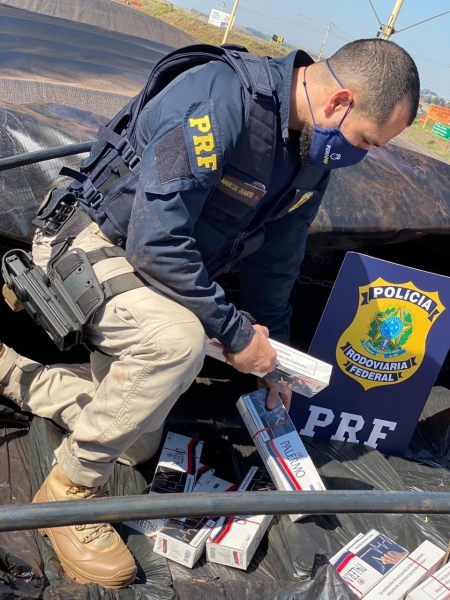 Na manhã desse sábado (18), a Polícia Rodoviária Federal apreendeu dois caminhões carregados de cigarro e prendeu um homem que era motorista de um dos veículos.