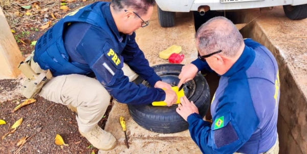 Assim, após a realização de inspeções minuciosas, foram flagrados 3,1 kg de crack e 2 kg de cocaína dentro do estepe localizado abaixo do porta-malas.