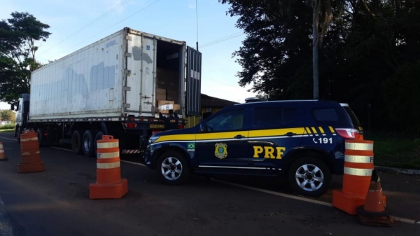 A Policia Rodoviária Federal (PRF) apreendeu, na manhã de hoje (21), um contêiner carregado com 500 mil carteiras de cigarros, na BR-163, em Quatro Pontes, na região oeste do Paraná.