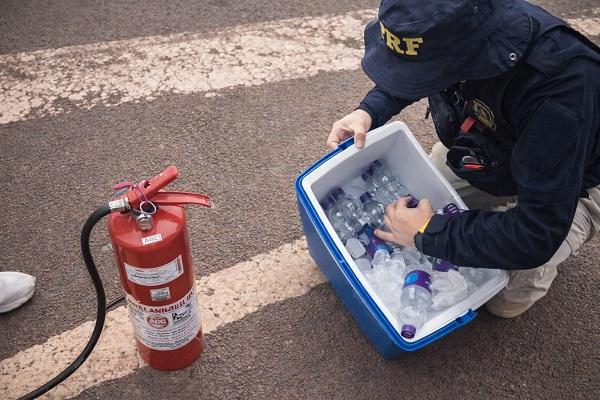 Durante a abordagem de um ônibus, os policiais localizaram, ocultos no forro de uma caixa térmica posicionada ao lado do motorista, diversas ampolas de medicamentos de importação não permitida, além de frascos de anabolizantes.
