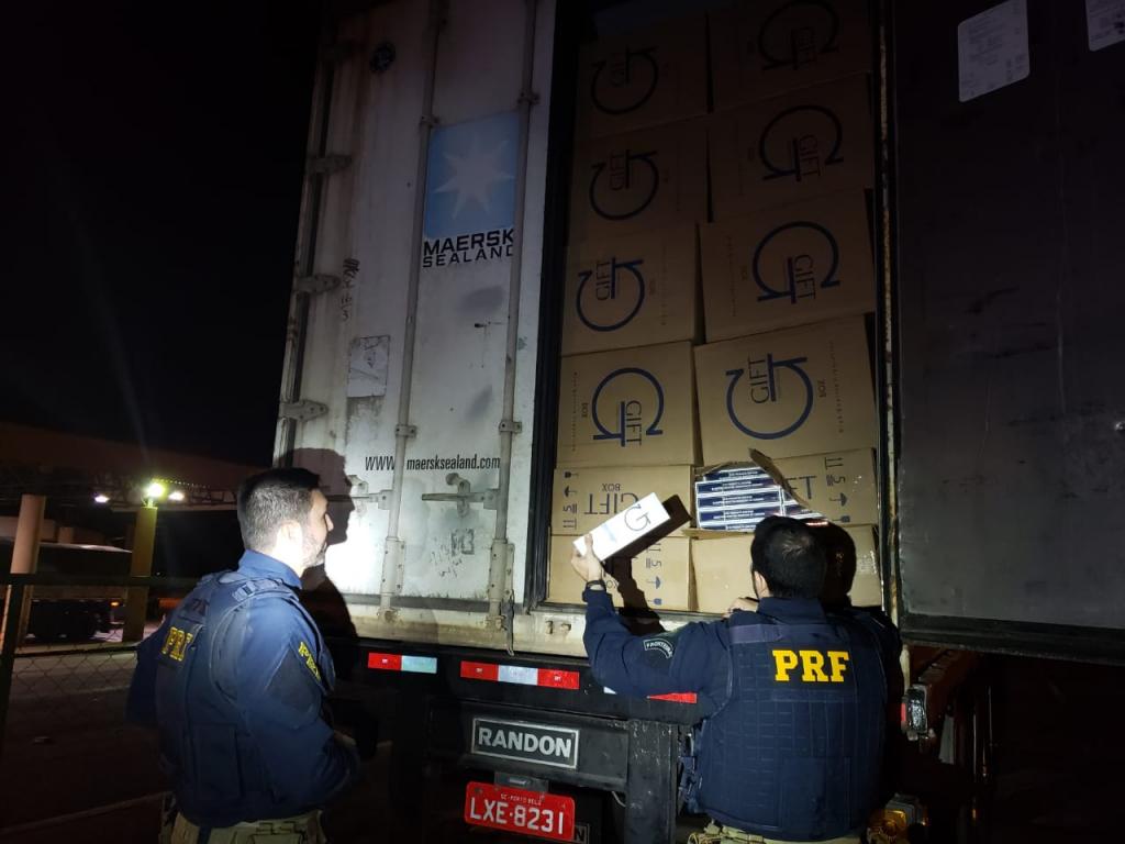 Na noite desta quinta (30), a Polícia Rodoviária Federal apreendeu um caminhão Scania branca, com contêiner carregado de cigarros contrabandeados do Paraguai, na BR 163 em Guaíra (PR).