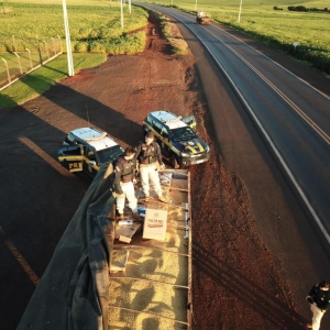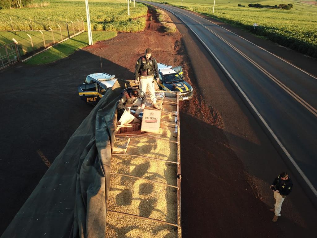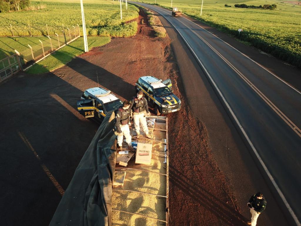 Contudo, diante do nervosismo apresentado pelo motorista no transcorrer da abordagem, a equipe realizou a vistoria da carga dos semirreboques, constatando que sob uma fina camada de soja a granel estavam acondicionadas várias caixas de cigarros de origem paraguaia.