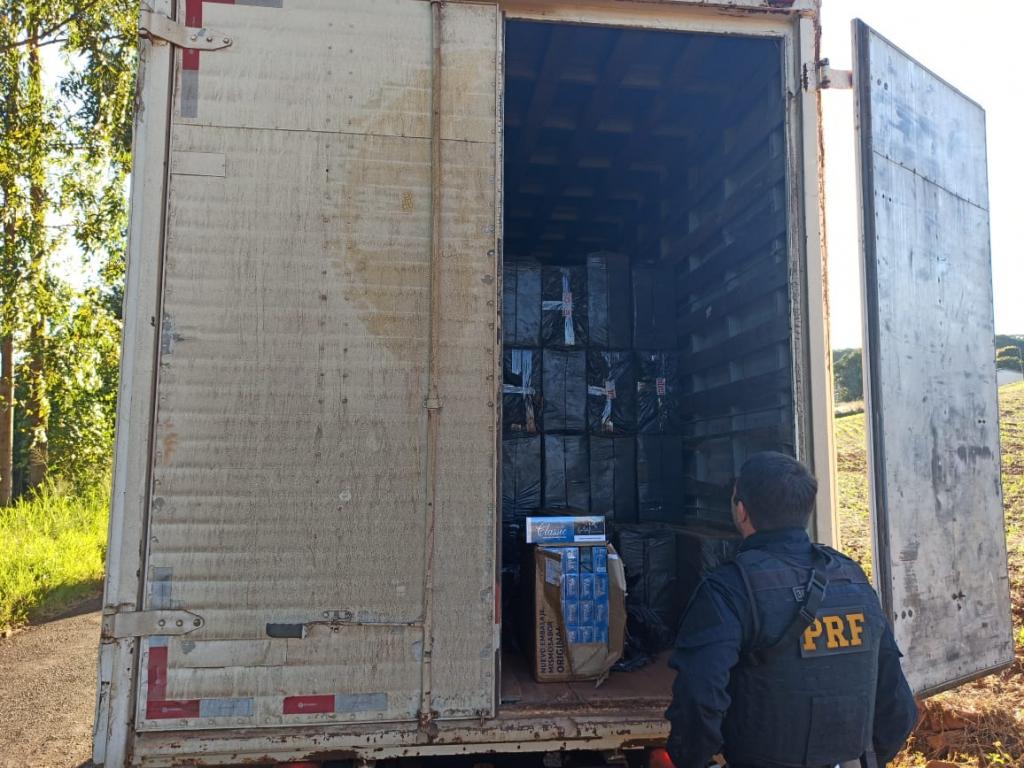 A Polícia Rodoviária Federal (PRF) apreendeu nesta manhã (10), em Santa Tereza do Oeste (PR), um caminhão baú carregado com cerca de 75 mil maços de cigarros contrabandeados do Paraguai. O motorista foi preso em flagrante.