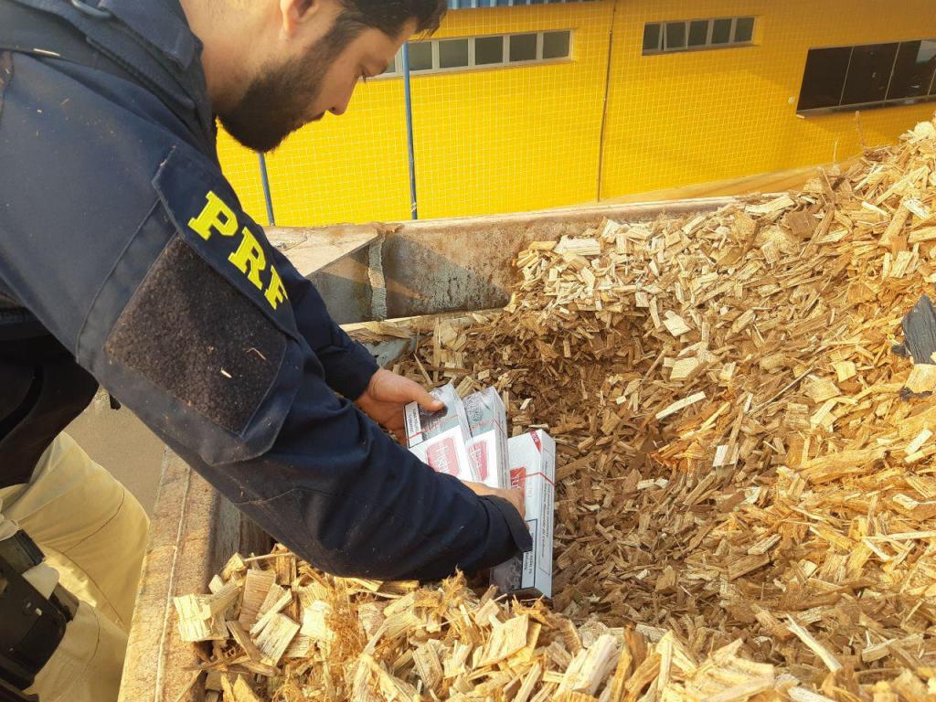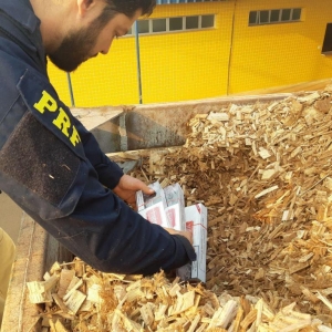 Contrabandeada do Paraguai e avaliada em pelo menos R$ 2 milhões, a carga ilícita estava escondida sob uma camada de cavaco de madeira (resíduos de eucalipto).