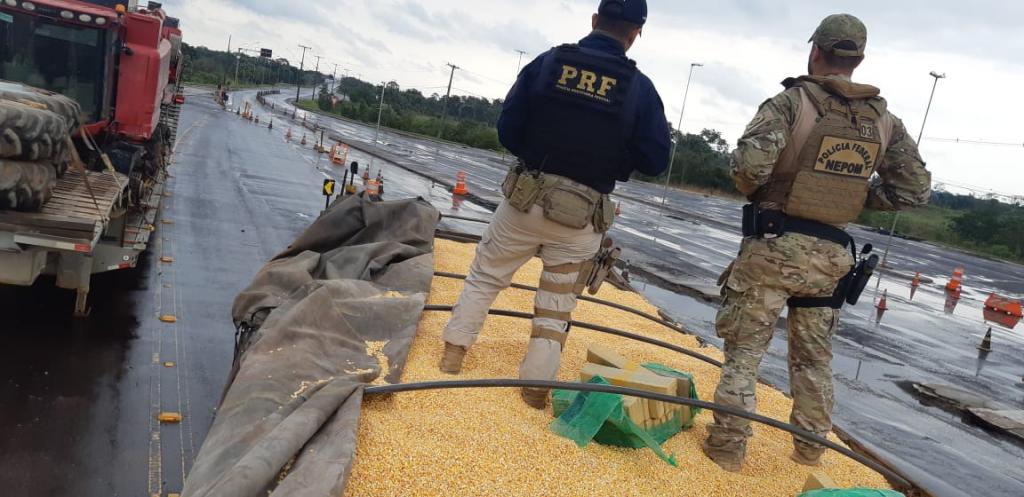 Por volta do meio-dia, policiais abordaram um motorista de 26 anos, que conduzia uma carreta, na BR-163, na ponta Ayrton Senna.na manhã deste sábado (15). Perguntado, o motorista disse estar carregando milho, apresentando a nota fiscal do produto transportado às equipes policiais.