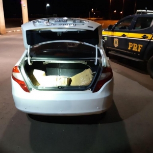 A Polícia Rodoviária Federal (PRF) apreendeu 90,4 quilos de maconha na noite deste sábado (11) em Guaíra, na região oeste do Paraná. A droga estava em um automóvel Jac J3, abordado em frente à Unidade Operacional Ponte Ayrton Senna, na BR-163.
