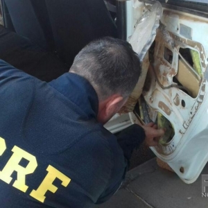 O taxista, de 50 anos de idade, transportava 27,2 quilos de maconha em compartimentos ocultos nas quatro portas de seu veículo, um Volkswagen Voyage.