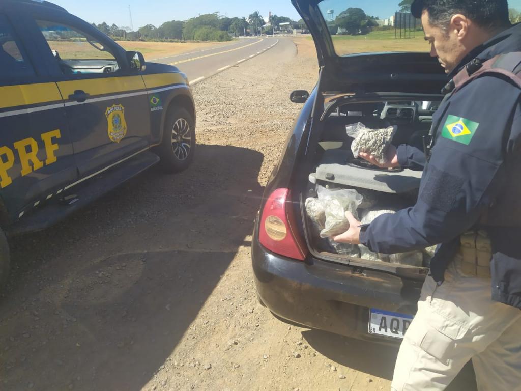 A Polícia Rodoviária Federal (PRF) apreendeu 74,225 quilos de "skunk" em Francisco Alves (PR), por volta das 12h desta quinta-feira (29), que era transportado em um veículo Renault Clio.