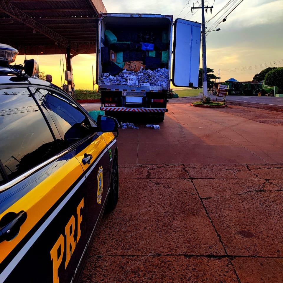 Enquanto recolhiam os veículos apreendidos, a equipe da PRF avistou um caminhão baú deslocando em atitude suspeita e também abordou o veículo. O condutor afirmou estar transportando frango, porém apresentou um nervosismo fora do normal. Questionado mais uma vez sobre a carga o motorista confessou que transportava cigarros contrabandeados. Ele também foi detido.