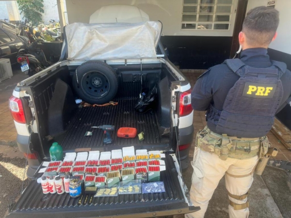 A Policia Rodoviária Federal apreendeu no dia de hoje (27) uma Fiat Strada transportando munições ocultas na lataria do veículo. Além de quase 1000 cartuchos utilizados em espingardas, também foram apreendidos insumos para a fabricação de munição de revólveres e pistolas.
