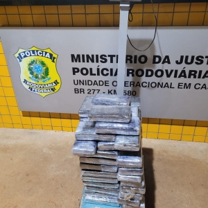 No início desta segunda-feira, no km 580.0 da BR 277, no município de Cascavel foi abordado o veículo Mercedes Benz placa WYAG634 do Paraguai, com um ocupante, também paraguaio. A equipe realizou a fiscalização para verificar equipamentos obrigatórios e ao abrir o porta malas do veículo foi encontrado compartimento entre o banco traseiro e o porta malas que após aberto constatou se 62 tabletes, que totalizaram 67KG de cocaína.