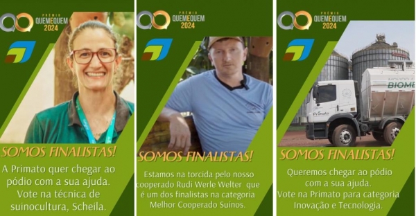 Ao todo são 12 categorias, onde três delas tem como destaque a Primato Cooperativa Agroindustrial, dentre elas: Inovação e Tecnologia; Melhor Cooperado Suínos (Rudi Werle Welter) e Melhor Assistência Técnica Suinocultura (Scheila Matias da Silva).