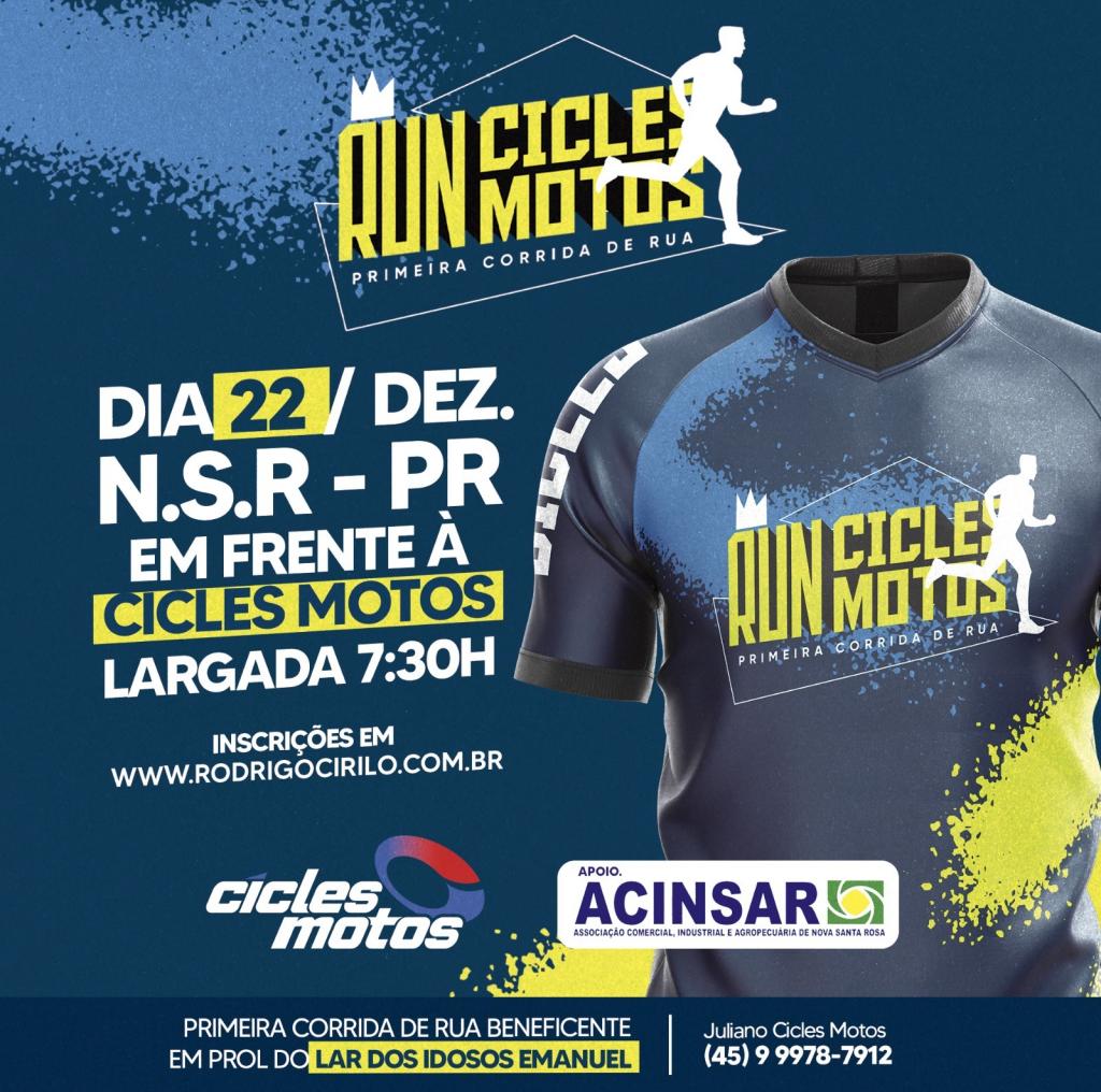 A Cicles Motos, com apoio da ACINSAR – Associação Comercial, Industrial e Agropecuária de Nova Santa Rosa - promoverá no próximo domingo (22), com a largada programada para às 7h30 em frente à Cicles Motos, a PRIMEIRA CORRIDA DE RUA BENEFICENTE, sendo que todo o valor e os alimentos arrecadados serão destinados ao Lar dos Idosos Emanuel.