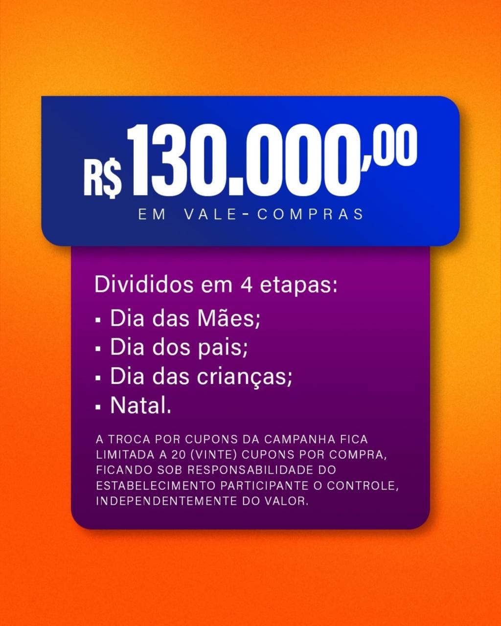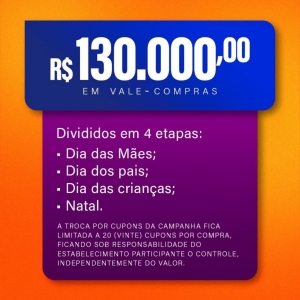 O consumidor a cada R$ 50,00 em compras, ganha um cupom para concorrer a vales-compra, sendo que as empresas participantes também serão premiadas.