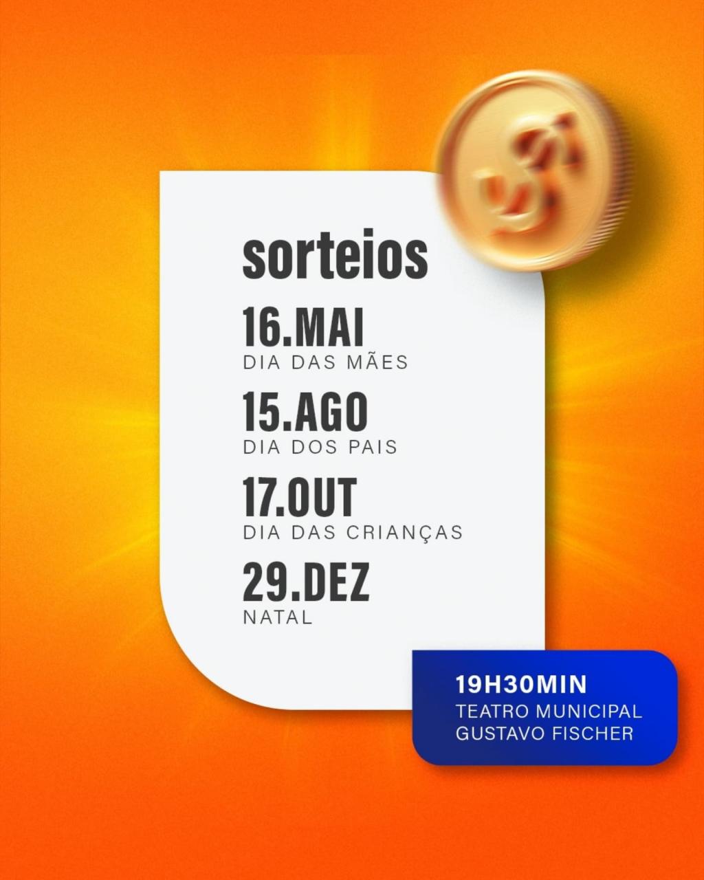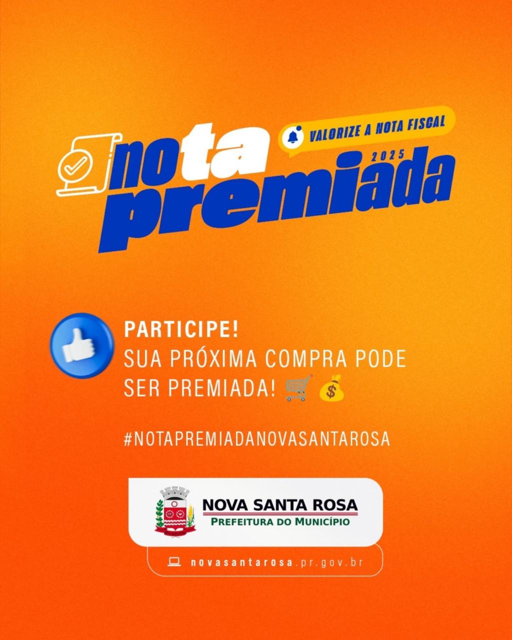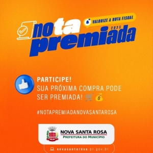 A Prefeitura de Nova Santa Rosa, por meio da Secretaria de Indústria, Comércio e Turismo, informa que o primeiro sorteio de 2025 da Campanha Nota Premiada – Valorize a Nota Fiscal, compre no comércio de Nova Santa Rosa e concorra a prêmios - ocorrerá no dia 16 de maio, alusivo ao Dia das Mães. Haverá ainda sorteio do Dia dos Pais, Dia das Crianças e Natal.