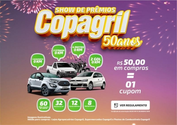O segundo sorteio da campanha será no dia 31 de dezembro de 2020. Para conferir o regulamento completo da campanha acesse: www.copagril.com.br/showdepremios50anos.