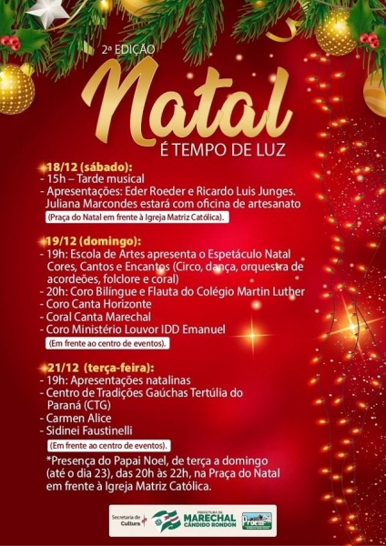 A programação do 2º Natal é Tempo de Luz, tem como ente promotor a prefeitura de Marechal Rondon, através da Secretaria Municipal de Cultura e recebe o apoio da Fundação Promotora de Eventos (PROEM).