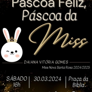A Miss Nova Santa Rosa, Daiana Vitória Gomes, está realizando o projeto “Páscoa Feliz, Páscoa da Miss”. O objetivo é ofertar, proporcionar, despertar e resgatar de forma natural e espontânea, as manifestações expressivas da Páscoa, do verdadeiro sentido que é a ressurreição de Cristo; valorizar a religiosidade e oportunizar momento lúdico, que é a entrega voluntária de ovos de Páscoa.