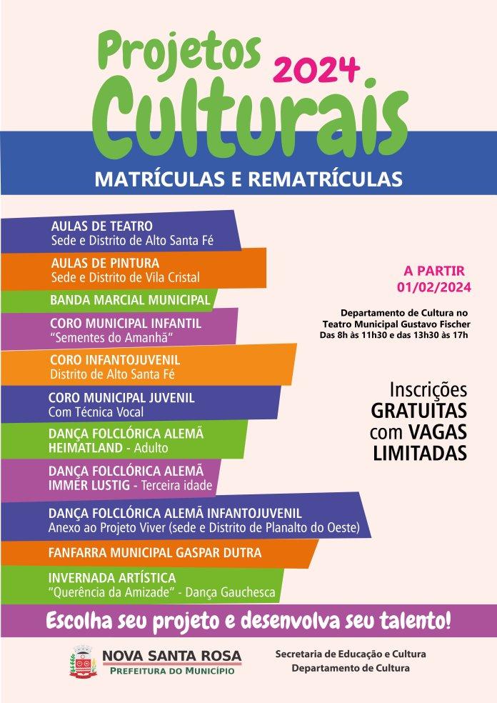 A Prefeitura de Nova Santa Rosa por meio do Departamento de Cultura de Nova Santa Rosa informa que as matrículas e rematrículas para os Projetos Culturais podem ser feitas para o período de 2024. As inscrições são gratuitas e as vagas limitadas. As inscrições podem ser feitas até o dia 29 de fevereiro.