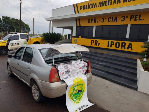 Após verificado que o veículo não apresentava queixa de furto/roubo e que os documentos pessoais do condutor estavam regulares, foi realizado uma busca no interior do veículo com o consentimento do mesmo, onde foi encontrado pacotes de cigarros oriundos do país vizinho, Paraguay, da marca EIGHT.
