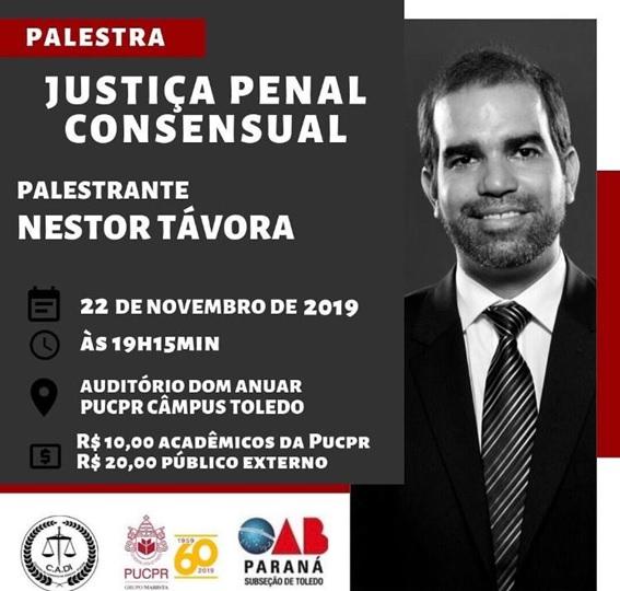 A Pontifícia Universidade Católica do Paraná Câmpus Toledo recebe a palestra “A Justiça Penal Consensual” conduzida pelo renomado jurista Nestor Távora. Para a coordenadora do Curso de Direito da PUCPR Câmpus Toledo, Vanessa Orlandi, Nestor Távora representa a inovação da forma de condução do processo penal com a base garantista dos direitos fundamentais. “Ele cortou a visão do legalismo extremista, trazendo uma nova ótica do direito penal humanizado, discutindo seus efeitos em todas as esferas jurídicas e sociais”, afirma.