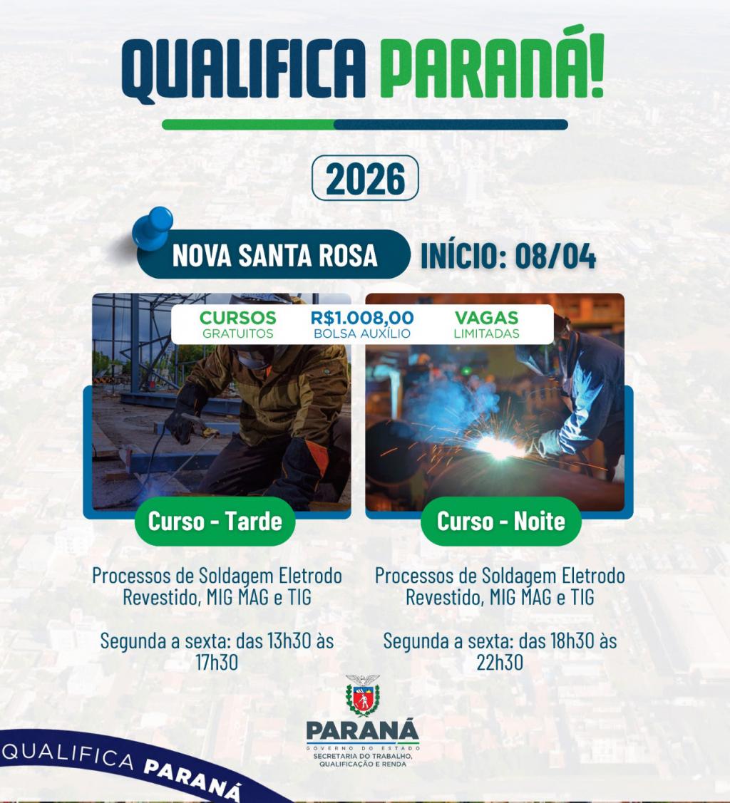 Estão abertas as inscrições para o curso gratuito de Processos de Soldagem Eletrodo Revestido, MIG/MAG e TIG, ofertado pelo programa Qualifica Paraná em Nova Santa Rosa. A iniciativa visa capacitar profissionais para atuação na indústria, com formação teórica e prática voltada à segurança e qualidade dos processos.