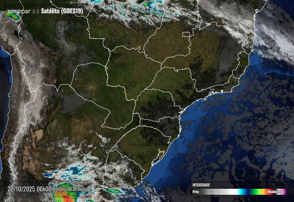 A imagem de satélite das primeiras horas desta quarta-feira (22) mostra o predomínio de tempo firme em quase todo o Paraná, especialmente no Oeste e Sudoeste, onde o céu aparece com poucas nuvens. A madrugada foi de temperaturas amenas, e o amanhecer apresenta condição típica de estabilidade atmosférica.