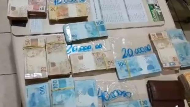 Após averiguação no interior do veículo com autorização do condutor foi localizada em uma bolsa vermelha com roupas uma certa quantia em dinheiro que após contagem totalizou R$ 92.600,00 em espécie.
