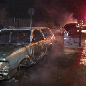 Três carros foram consumidos pelas chamas e um ficou parcialmente destruído em um incêndio criminoso. No local, um homem acabou sendo alvejado por disparos de arma calibre 12.